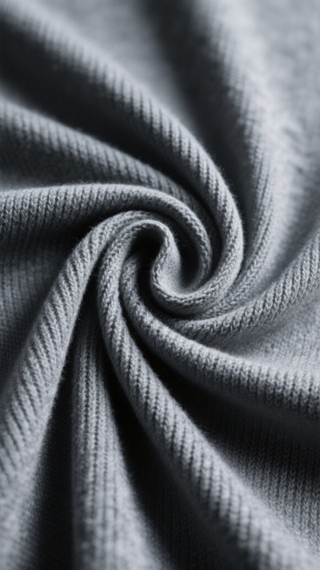 灰色布料,特写镜头,细腻的针织纹理,呈现出柔和的螺旋状褶皱,光线从斜上方照射,形成微妙的明暗对比,布料表面光滑且带有轻微的光泽感,整体色调为深灰色,背景简洁单一,突出布料的质感和垂坠感,高分辨率,清晰的细节,写实风格。