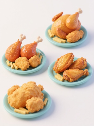 纯白色背景上,一组四个不同形态的炸鸡产品,均保持超写实主义风格,展现金黄酥脆的炸鸡质感,表面纹理清晰可见,油光细腻自然,光影效果柔和,立体感强。第一个是经典炸鸡腿,第二个是外酥里嫩的炸鸡块,第三个是金黄诱人的炸鸡翅,第四个是饱满厚实的炸全翅,四个元素规整排布,形成系列感,整体画面简洁干净,突出炸鸡的美味诱人,符合食品宣传的设计感和视觉吸引力。