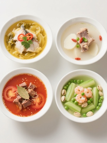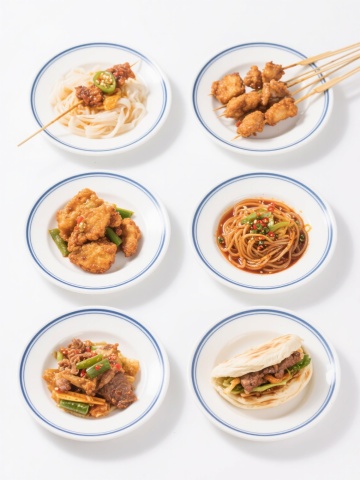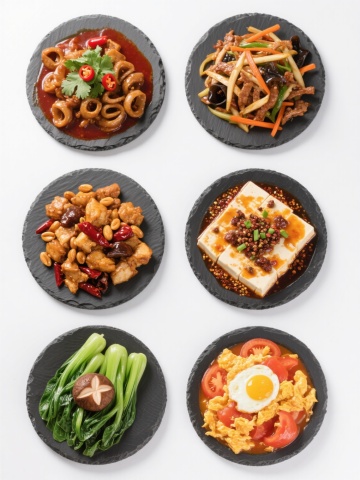 一系列6张简约现代风格的中式菜肴素材,每张素材均为单一元素图案规整排布,元素分别为白色圆形瓷盘盛放的不同中式菜肴,整体造型简约现代,采用纯白色纯色背景,无任何文字,无logo,无水印,高清晰度,食物细节丰富,色彩真实自然,光影柔和,突出食物质感。