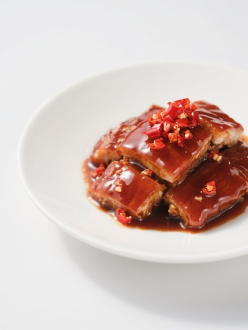 一张白色圆形瓷盘盛放的中式菜肴,菜品色泽红亮诱人,表面覆盖光泽感的酱汁,点缀细小的红色辣椒碎,食材形态自然堆叠,具有清晰的质感和细节,纯色白色背景,简约现代风格,整体构图规整居中,无任何文字、logo或水印