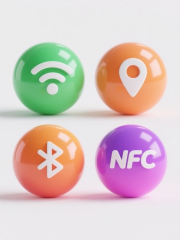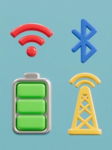 四个不同色彩的3D立体图标系列,每个图标都具有光滑的金属质感和明亮的高光效果,风格统一为现代简约设计。第一个图标是红色的Wi-Fi符号,第二个是蓝色的蓝牙标志,第三个是绿色的电池满格图标,第四个是黄色的信号塔图形。所有图标均以纯色背景呈现,采用规整的网格布局排列,整体设计简洁明了,适合用于科技类应用的界面元素或功能图标集合。
