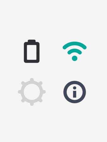 四个纯色背景的圆形图标系列,每个图标均有内圈浅色边框和轻微阴影效果,内部为简约的白色几何符号,第一个图标为红色圆形内白色Wi-Fi符号,第二个为绿色圆形内白色蓝牙符号,第三个为黄色圆形内白色电池满格符号,第四个为紫色圆形内白色音量符号,四个图标规整并排排布,保持统一的扁平化设计风格和视觉层级。