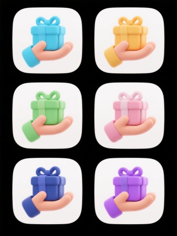 六个具有相同内容和风格的系列礼品盒图标素材集合,每个图标均为圆角矩形礼品盒形状,顶部系有对称蝴蝶结,采用简洁现代的扁平设计风格,带有柔和的渐变填充和轻微的高光阴影以体现立体感,背景为纯色且与礼品盒形成鲜明对比,六个图标规整排列成一行或两行三列的网格布局,第一个礼品盒为红色主体配深红色蝴蝶结,第二个为蓝色主体配深蓝色蝴蝶结,第三个为绿色主体配深绿色蝴蝶结,第四个为紫色主体配深紫色蝴蝶结,第五个为粉色主体配深粉色蝴蝶结,第六个为橙色主体配深橙色蝴蝶结,所有图标保持一致的尺寸大小和视觉重量,整体呈现出协调统一的系列感。