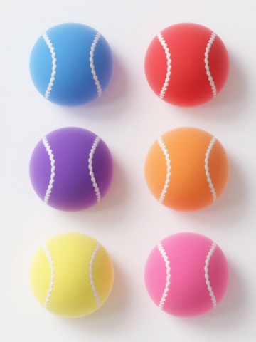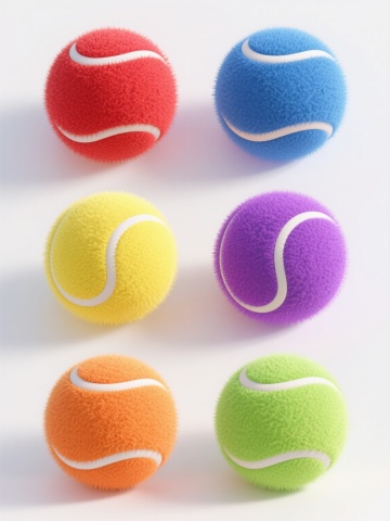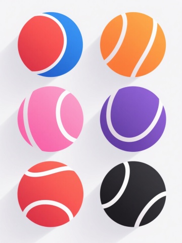 白色背景上,六个不同色彩的网球元素以规整网格排布的系列图标集合,每个网球保持相同的简约扁平化风格,圆形轮廓,白色缝线纹理,柔和的渐变色彩填充,统一的光影处理和细腻的颗粒质感,色彩分别为红色、蓝色、黄色、紫色、橙色和绿色,整体呈现出协调一致的视觉美感和网球运动的活力氛围。