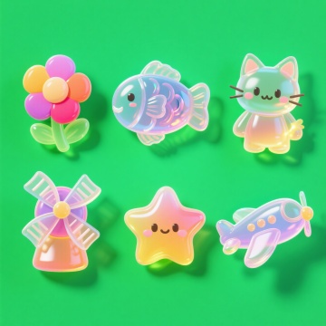 3D风格,6个不同配色、不同样式、不同材质的卡通趣味元素,每个元素都具有圆润可爱的造型,明亮鲜艳的色彩搭配,部分元素带有光滑的塑料质感和柔和的高光,整体呈现出活泼欢快的氛围,白色背景,元素排列整齐有序,构图均衡,视觉层级清晰,信息传达高效,符合儿童或年轻受众的审美,充满设计感。