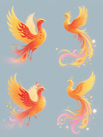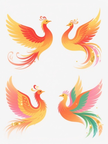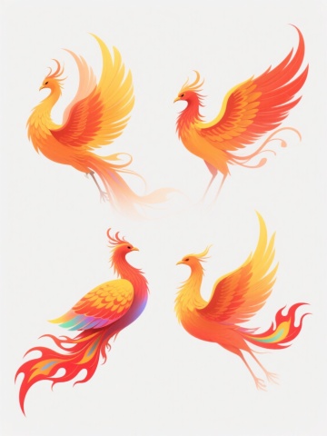 中国传统国潮风格插画,一只色彩绚丽的凤凰展翅飞翔,主体羽毛呈橙红色渐变,翅膀羽毛尖端为明亮的黄色,带有金色高光点缀,头部有精致的红色冠羽,颈部羽毛层次分明,尾部拖着飘逸的五彩长尾,包含红色、橙色、绿色和黄色的卷曲飘带,周围环绕着传统祥云图案,云朵呈白色、浅黄和橙色,线条流畅优美,整体构图充满动感与力量,色彩浓郁和谐,具有鲜明的中国传统文化韵味和现代设计美感,画面背景为纯白色,突出主体形象的精致细节和华丽色彩。