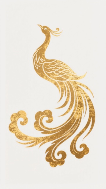 中国传统风格插画,一只展翅飞翔的凤凰,羽毛洁白,尾羽呈现橙红、翠绿、金黄等渐变色彩,头部有精致的红色冠羽,眼神锐利有神,背景是巨大的金色圆形太阳,周围环绕着橙红、赭石色的祥云和波浪状卷曲纹样,整体色调以暖橙色、金色为主,点缀蓝色和绿色,具有浓厚的中国神话色彩和华丽的装饰感,笔触细腻,线条流畅,充满动感与祥瑞氛围。