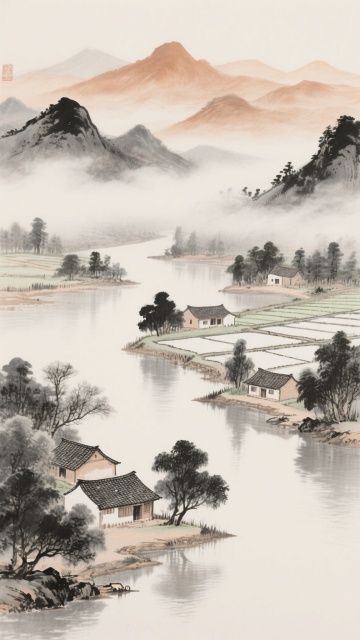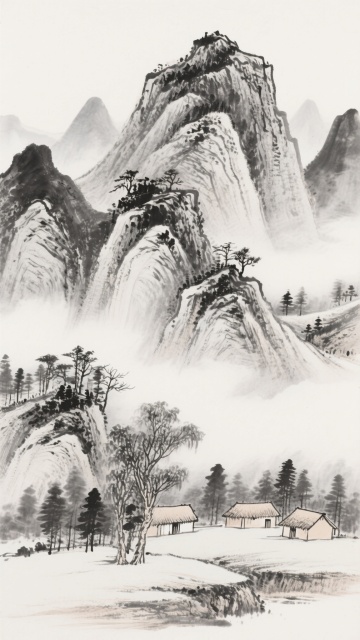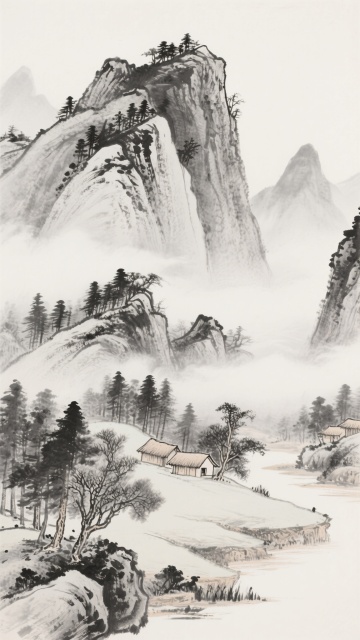 中国传统水墨山水画风格,以黑白灰为基调,运用淡墨渲染出远山的朦胧意境与近景的清晰笔触,展现干笔皴擦的山石纹理与湿墨晕染的云雾效果,整体构图采用高远与深远相结合的变换布局,画面下方以溪流、亭台、树木为近景,中部以开阔水面连接两岸山峦,上方以层叠起伏的远山与缥缈云雾营造空间层次感,保留原作中水墨特有的留白韵味与静谧悠远的东方美学氛围,无LOGO、文字及二维码等元素。