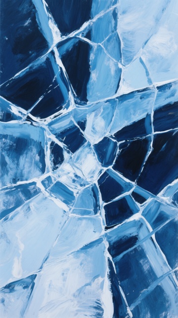 抽象表现主义风格的冰裂纹理背景,以深蓝、浅蓝和白色为主色调,笔触厚重而富有动感,冰面裂纹呈现出自然流动的线条和不规则的几何形态,光影效果柔和,整体营造出一种寒冷而神秘的氛围,画面具有强烈的视觉冲击力和艺术感染力。