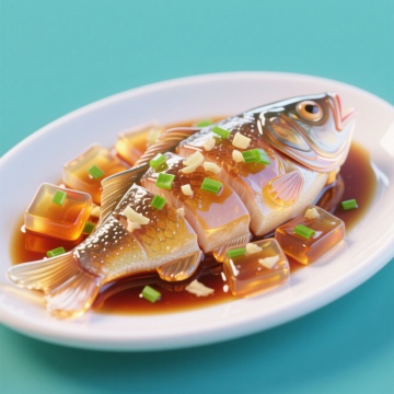 软3D风格美食插画,纯色背景,四宫格规整排布,每个格子为不同色彩主题的鱼类菜肴:左上角是橙黄色调的烤鱼,鱼身带烤痕,配柠檬片与香草;右上角是棕红色调的红烧鱼,覆盖浓稠酱汁,点缀葱花;左下角是奶白色调的清蒸鱼,鱼眼突出,旁置姜丝与葱段;右下角是红色调的水煮鱼,浸在红油汤中,撒有辣椒与花椒,所有元素保持统一的软3D质感、光影效果和装饰细节,整体色调明快,风格统一。