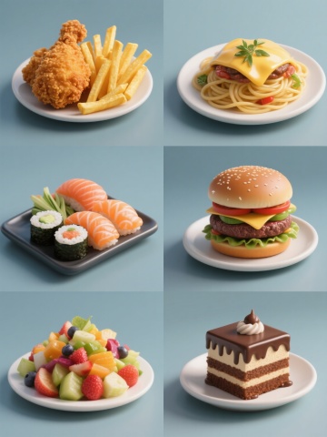 软3D风格的快餐食品系列素材集合,纯色背景,画面整体色彩变换,包含四个完全不同元素内容且规整排布的软3D食物图标:左上角是撒有香草、点缀着红椒和青椒丁的圆形披萨,右上角是夹着生菜、番茄片和肉饼的双层汉堡,左下角是金黄酥脆、堆叠在一起的炸鸡块,右下角是装在红色纸盒中、色泽诱人的薯条,所有元素保持统一的软3D质感、明亮欢快的氛围和简洁的构图,整体视觉层级清晰,信息传达高效。