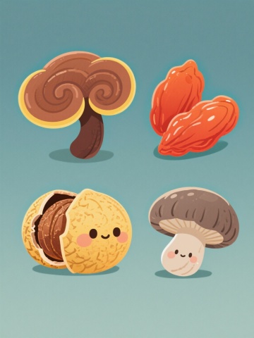 一组四个中国传统滋补食材的卡通手绘插画系列,保持可爱Q萌的风格,线条圆润流畅,色彩鲜亮明快,光影表现柔和,边缘有轻微模糊处理。第一个食材为棕色灵芝,菌盖呈螺旋状层层叠叠,边缘有黄色晕边,菌柄深褐色,置于纯色背景上;第二个食材为橙红色枸杞,颗粒饱满圆润,带有高光质感,置于另一不同色调的纯色背景上;第三个食材为黄色干桂圆,外壳有细微纹理,部分剥开露出棕褐色果肉,置于再一不同色调的纯色背景上;第四个食材为灰褐色香菇,菌盖厚实有自然褶皱,菌褶清晰可见,菌柄短粗,置于最后一个不同色调的纯色背景上。四个食材插画整体色彩变换为不同色调但保持和谐统一,规整排布成系列素材集合,细节丰富,整体风格统一。