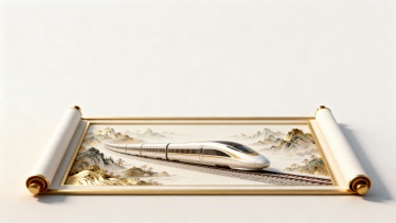 国潮风插画,融合中式山水与未来列车,鎏金轨道穿行于梦幻花海,金属光泽与刺绣质感交织,展现科技与传统的奢华对话。