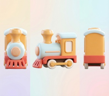 一套6个不同元素的儿童玩具用品集合,每个元素都采用圆润可爱的卡通3D风格,纯色背景,色彩鲜艳明快,高光泽度材质,柔和光影效果,元素类目保持一致,整体呈规整的网格状排布,元素包括:蓝色手柄粉色边缘放大镜、黄色发条红色底座小火车、绿色叶子造型儿童牙刷、橙色圆形积木拼图、紫色星星图案小书包、红色塑料小喇叭,每个元素都有清晰的轮廓和细节,适合儿童产品宣传海报设计,视觉层次分明,信息传达高效,符合儿童审美和产品展示目的。