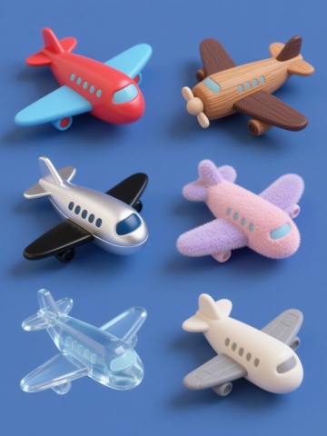 一系列6个相同造型卡通飞机玩具的规整排布集合,每个飞机采用完全不同的材质表现,均为纯色背景,保持原有的机身、机翼、尾翼结构和窗户布局,变换元素造型和整体色彩。第一个飞机为光滑塑料材质,亮红色机身配天蓝色机翼;第二个为木质纹理材质,暖棕色机身配深棕色机翼;第三个为金属质感材质,银白色机身配哑光黑色机翼;第四个为毛绒材质,粉色机身配浅紫色机翼;第五个为透明水晶材质,淡蓝色半透明机身配深蓝色机翼;第六个为磨砂陶瓷材质,米白色机身配灰色机翼,所有飞机以2行3列整齐排列,每个飞机独立置于对应纯色背景中,整体构图平衡对称,色彩鲜明且材质特征突出。