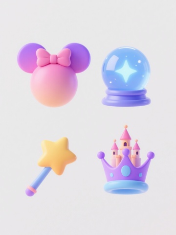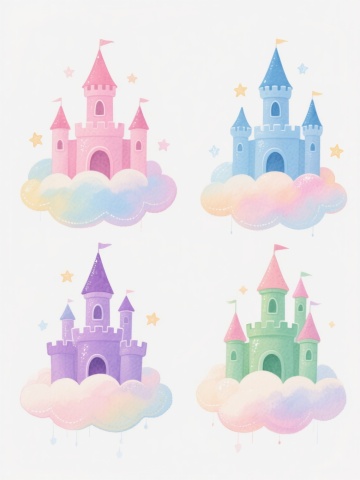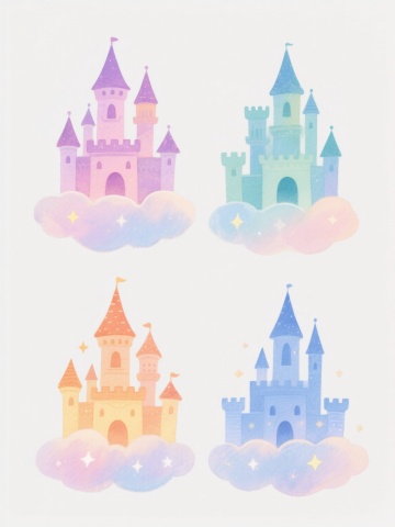 4个不同配色、不同样式、不同外观的可爱卡通城堡,保持Q版3D风格,圆润造型,平滑渐变色彩,柔和光影,每个城堡都有独特的塔楼形状、旗帜样式和窗户设计,底部有云朵装饰,所有城堡在纯白色背景上排列整齐,整体氛围梦幻甜美,充满童话色彩,精致细节,高清渲染,无文字元素