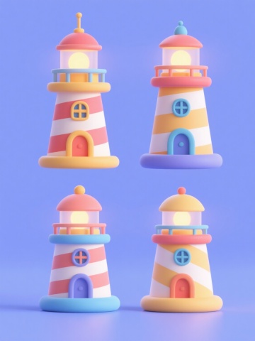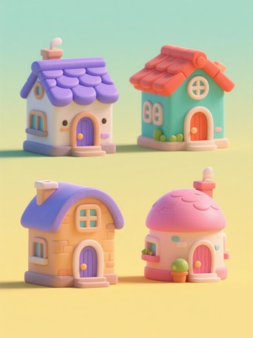 一组四个3D卡通风格建筑模型的系列集合插画,每个模型独立展示在纯色背景上且整体色彩各不相同,保持原温暖童话风格的圆润造型、柔和高光、细腻材质表现和可爱氛围,第一个是带有橙色瓦片屋顶和米色墙壁的小房子,配有拱形门窗、白色花朵盆栽和绿色小恐龙装饰;第二个是蓝色尖顶城堡,带有金色塔楼尖顶、彩色玻璃窗和红色大门,周围点缀着紫色小花丛;第三个是粉色蘑菇形状小屋,拥有白色波点伞盖、黄色圆形门窗和木质小门廊,旁边放着棕色蘑菇凳;第四个是绿色树屋造型建筑,树干纹理墙壁搭配棕色树枝屋顶,设有树叶形状窗户和藤蔓缠绕的木质楼梯,整体呈田字格规整排布,每个模型底部都有灰色石板底座,光影统一为柔和的顶部光源效果。