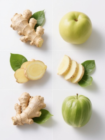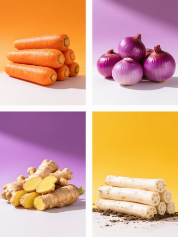 一系列6个不同元素的食品素材集合,每个元素均采用高清写实摄影风格,纯色背景,保持与原图一致的光影效果、立体感和细节质感,元素分别为:1. 完整带叶的新鲜生姜及切片,2. 饱满的大蒜头及蒜瓣,3. 红皮洋葱及切开的剖面,4. 带叶的胡萝卜及切片,5. 土豆及切块,6. 带根须的新鲜莲藕及切片,所有元素规整排布,色彩根据各自食材特性调整,保持整体视觉统一性。