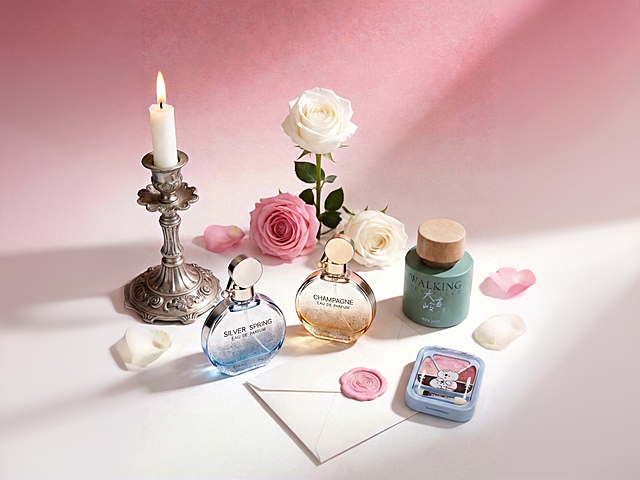 唯美感与浪漫感交织的3D重拟物风香水场景,玻璃瓶身透出柔和光影,玫瑰花瓣环绕,营造清新优雅的实景氛围。详情