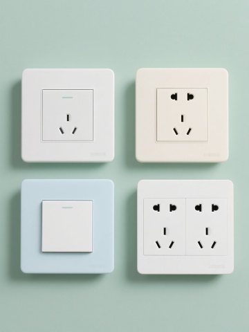 现代简约风格的4个不同种类白色哑光面板开关插座产品,以规整的2x2网格排布在纯色背景上,从左上角顺时针依次为双开单控开关、圆形旋钮开关、触摸感应开关和单开翘板开关,高分辨率3D渲染,柔和的顶部光源照射,每个产品底部带有轻微的投影效果以增强立体感,清晰展示产品的边缘线条、面板质感和操作部件细节,整体呈现统一的设计语言,适合电商产品展示或产品目录使用的高品质产品静物图。