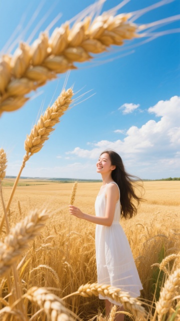 一位身穿白色薄纱上衣的女性,头发被风吹起,背景是广阔的绿色草地和晴朗的蓝天,阳光明媚,整体氛围清新自然。
