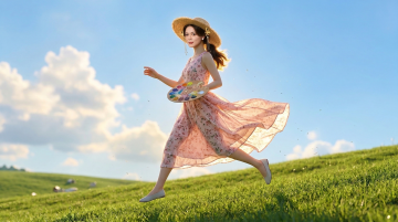 少女在花海中翩翩起舞,蝴蝶环绕,清新甜美,超现实主义的虚拟自然景象。