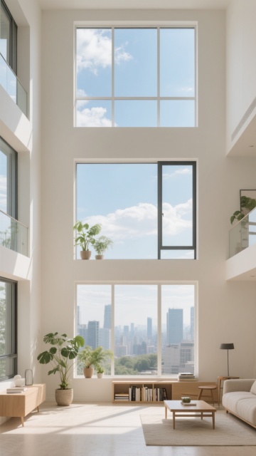 极简主义风格室内场景,不同角度、场景、布置的窗户设计,明亮通透的大尺寸玻璃窗,窗外是蓝天白云与城市远景,室内柔和自然光照射,浅色墙面与地面,窗边摆放绿植盆栽、书籍和简约家具,干净利落的线条,高清晰度,温暖舒适的氛围,现代家居设计感,不同窗户造型与周围环境的和谐搭配,光影层次感丰富。