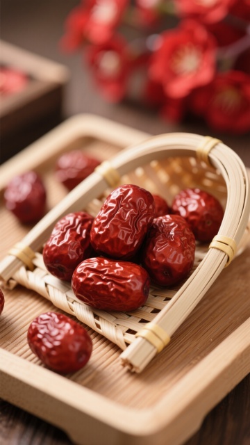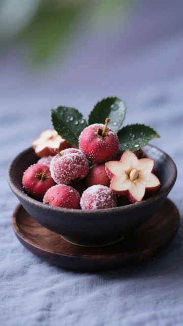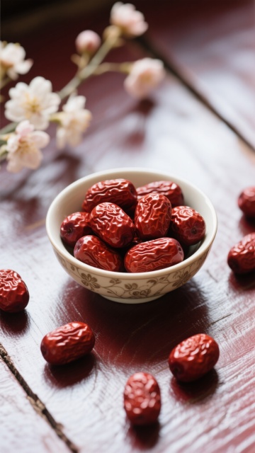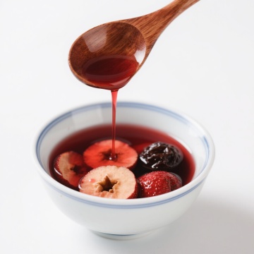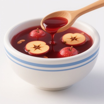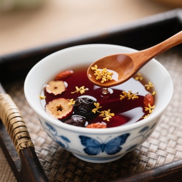 一碗盛在带有蓝色蝴蝶花纹的白色瓷碗中的酸梅汤,汤汁呈现出浓郁透亮的深红色,碗内漂浮着山楂片、乌梅等食材,表面撒有金黄的桂花。一只木勺正从碗中舀起一勺酸梅汤,汤汁欲滴,木勺纹理清晰。瓷碗放置在深色木质托盘上,整体画面明亮清新,光影柔和,突出酸梅汤的诱人色泽和食材细节,营造出清爽解暑的氛围。