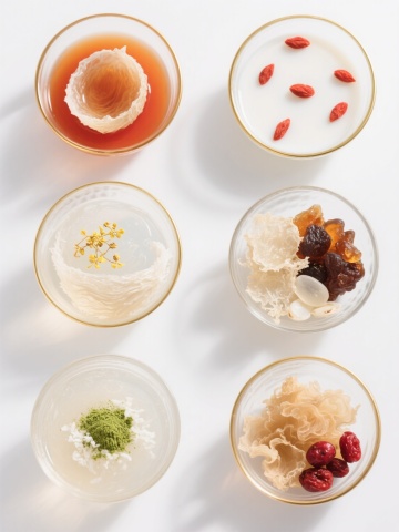高清晰写实风格的茶元素系列素材集合,六个完全不同的茶相关元素规整排布在纯白色纯色背景上,保持透明玻璃材质的细腻质感和金黄茶水的通透光泽,光影效果统一为柔和的顶部光源,阴影清晰自然。第一个元素:透明玻璃盖碗中盛放着嫩绿的碧螺春茶叶,茶汤清澈;第二个元素:紫砂茶壶搭配四个小茶杯,壶嘴微微倾斜,仿佛刚倒出茶水;第三个元素:透明玻璃公道杯下方摆放着三个不同品种的干茶样本,分别是红茶、绿茶和乌龙茶;第四个元素:青瓷茶杯中漂浮着几朵茉莉花,茶汤呈现淡黄色;第五个元素:黑色陶制茶则中装满了条形的武夷岩茶,旁边放着一把竹制茶针;第六个元素:透明玻璃茶壶中浸泡着普洱茶饼,茶汤呈深红色,壶身上有简约的线条花纹。所有元素保持统一的写实风格和光影处理,整体构图平衡对称,每个元素独立成组又相互协调,形成完整的茶元素系列集合。