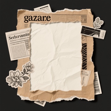 一组六个不同配色、不同造型的复古报纸素材集合,每个素材都具有手工拼贴风格,报纸呈现出撕裂边缘、褶皱质感和复古印刷纹理,背景为纯色(分别为米白、浅灰、淡棕、浅蓝、淡绿、浅黄),素材整体色彩统一且柔和,规整地排列在画面中,保持了旧报纸的怀旧氛围和层次感,每个素材的报纸排版和造型略有变化,形成丰富而协调的视觉效果。