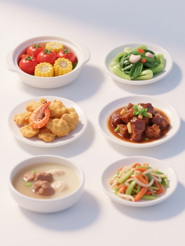 六宫格布局的中式美食系列海报,每张海报为纯色背景,整体色彩变换,保持写实摄影风格,光影运用为柔和顶光,高光表现自然,阴影细节丰富,食物表面质感细腻,酱汁光泽感强。第一张:深棕色粗陶碗中盛放着色泽金黄的三杯鸡,鸡肉块大小均匀,点缀翠绿九层塔,碗边有酱汁滴落;第二张:白色骨瓷盘里摆放着红亮诱人的红烧排骨,排骨肉质紧实,撒有白色芝麻,盘底铺着几片嫩绿生菜;第三张:黑色石锅中沸腾着香辣的水煮鱼,鱼片洁白嫩滑,漂浮着红色辣椒和黄色姜片,汤汁鲜红透亮;第四张:浅蓝色瓷碗中装着热气腾腾的香菇滑鸡粥,粥体浓稠,表面撒有葱花和枸杞,碗边放着一双竹筷;第五张:粉色磁盘里码放着精致的虾饺皇,饺子皮晶莹剔透,隐约可见里面的鲜虾,旁边放着一小碟醋;第六张:绿色荷叶盘中盛着香煎三文鱼排,鱼肉呈橙红色,外皮金黄酥脆,搭配柠檬片和绿色时蔬。每张海报视觉层级清晰,食物主体突出,背景纯色简洁,整体设计符合中式美食宣传的目标受众审美,信息传达效率高,排版整齐规整,六宫格元素类目相同,风格统一。