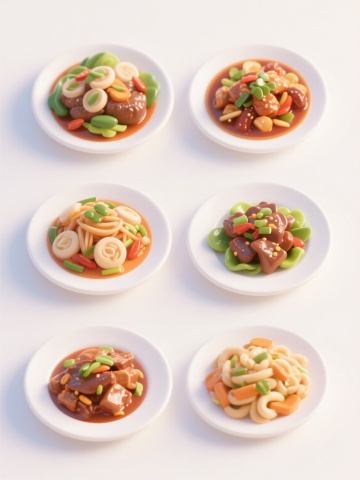 1. 特写视角,6个等距排列的纯色背景美食特写,第一格是根根分明油亮金黄的牛肉炒面,第二格是酱香浓郁颗粒分明的宫保鸡丁,第三格是色泽红亮辣椒点缀的回锅肉,第四格是翠绿蔬菜搭配金黄蛋丝的炒三丝,第五格是鲜汁饱满虾仁饱满的龙井虾仁,第六格是香嫩鸡块裹粉酥脆的炸鸡块,高清晰细节足,光线柔和立体感强,突出各中餐美食诱人质感与丰富色彩