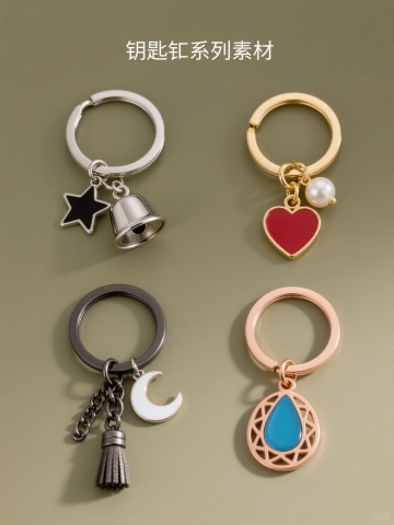 六个不同样式的金属铃铛,每个铃铛具有独特的设计元素,包括不同的表面纹理、铃铛形状和装饰细节,配色各异,有金色、银色、铜色以及带有彩色珐琅点缀的款式,每个铃铛都通过不同颜色的绳索悬挂,整体排列整齐,背景为纯白色,光线明亮柔和,突出铃铛的金属质感和细节,呈现出清晰、干净的视觉效果,适合作为产品展示或设计素材。