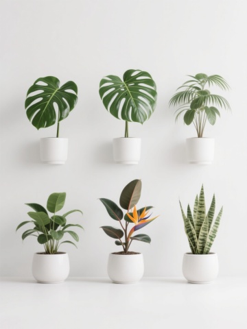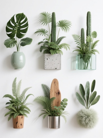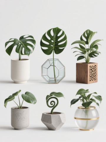 白色背景上,以原始图像中茂密热带植物组合为基础造型元素进行变换设计,生成六个完全不同材质的同系列素材集合,整体呈规整排布。这些植物元素造型需保留热带植物的形态特征,包括宽大的龟背竹叶、细长的棕榈叶、柱状的仙人掌以及各种层次丰富的蕨类和草本植物,它们错落有致地组合成具有自然生态感的整体轮廓。六个素材分别呈现六种截然不同的材质质感:第一个为光滑亮泽的陶瓷材质,表面有细腻釉面反光,色彩纯净;第二个是粗糙的混凝土材质,带有自然的水泥纹理和细微气孔;第三个是透明通透的玻璃材质,边缘有精致的磨砂处理,光线照射下有柔和折射;第四个是温暖的木质材质,展现清晰的木纹肌理和自然的木结疤;第五个是金属质感,呈现出哑光金属的细腻光泽和冷硬质感;第六个是柔软的毛绒材质,表面有蓬松的绒毛感,色彩柔和。所有材质的植物元素色彩均以绿色系为基础,根据不同材质特性呈现出相应的色调变化,整体构图保持对称平衡,每个材质的植物组合在白色背景上独立成组又相互呼应,形成统一且富有变化的视觉效果,整体设计简洁现代,具有强烈的装饰性和设计感。