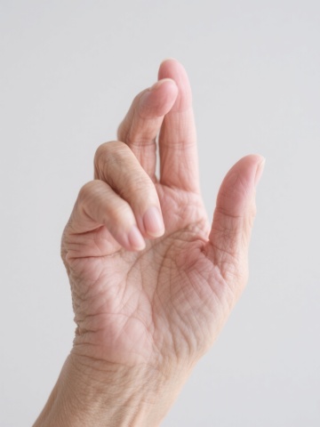 一张高度写实的手部特写摄影照片,纯白色纯色背景,光线柔和均匀来自斜上方,清晰展现皮肤细腻质感与自然纹理,手腕至指尖完整入镜,食指与中指并拢微微向上抬起,无名指与小指自然弯曲,拇指轻靠食指根部,呈现优雅自然的姿态,手部为老年女性的手,皮肤略显松弛带有细密皱纹,指关节突出,指甲修剪整齐呈自然淡粉色,整体画面干净简洁,突出手部的形态与皮肤细节,具有产品展示级别的清晰画质与柔和光影效果。