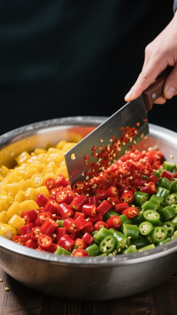 特写镜头下,不锈钢盆中铺满大量被切成小段的新鲜辣椒,辣椒段呈现出鲜明的色彩分区,从左到右依次为鲜亮的黄色、热烈的红色和清新的绿色,色彩过渡自然且对比强烈,辣椒籽与辣椒肉的纹理清晰可见,充满质感。一只手握着中式菜刀正从红色辣椒区域向下切剁,刀刃上沾着细碎的辣椒末,动态感十足,背景为深色,突出主体辣椒的鲜艳色彩和切割动作的生动性,整体画面光影柔和,聚焦于辣椒的丰富色彩和切割瞬间的鲜活感,营造出充满活力和烟火气的烹饪场景氛围。