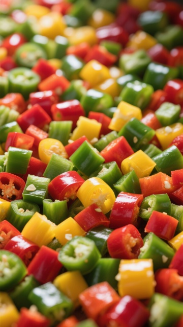 特写镜头下,不同颜色的新鲜辣椒被切成丁状铺满整个画面作为背景,有鲜艳的红色、明亮的黄色和翠绿的青色辣椒丁,它们大小均匀、颗粒饱满,展现出丰富的色彩层次和新鲜的质感,整体呈现出一种充满活力和食欲的视觉效果,光线从上方斜射下来,照亮辣椒表面并形成柔和的阴影,突出辣椒的立体感和细节,营造出一种热烈、鲜活的氛围。