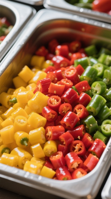 超写实美食摄影风格,特写镜头,不锈钢容器中铺满被切成小段的彩色辣椒,辣椒段按色彩自然分区,左侧为鲜亮的黄色,中间是饱满的红色,右侧为清新的绿色,色彩饱和且过渡自然,阳光下辣椒表面泛着水润光泽,展现出新鲜的质感,画面充满生机与活力,突出辣椒的丰富色彩和诱人形态,无文字信息。