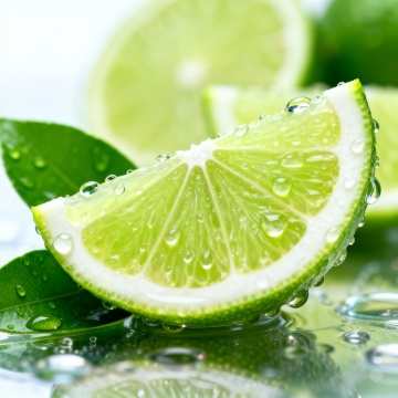 软3D风格,凉爽透明的背景,几片新鲜的柠檬和青柠切片悬浮其中,果肉纹理清晰可见,表面覆盖着晶莹剔透的水珠和大小不一的气泡,整体色调以清爽的黄色、绿色和透明感为主,光线柔和,营造出冰凉解暑的氛围,画面构图饱满,充满夏日清凉感。