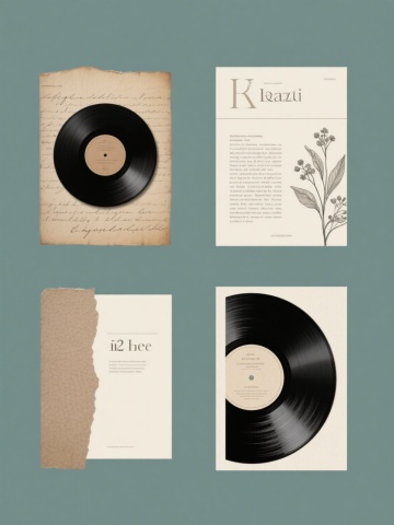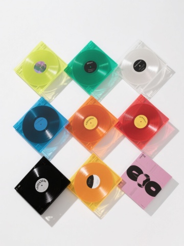 4张不同样式的黑胶唱片,分别配以红色、蓝色、黄色、绿色的唱片中心标签,每张唱片均呈现出清晰的黑色沟槽纹理和光滑的黑色塑胶质感,整体采用极简写实风格,以白色为背景,唱片呈整齐的2x2网格排列,光线从顶部偏左方向均匀照射,在唱片边缘形成轻微的高光和柔和阴影,营造出干净、现代的视觉效果。