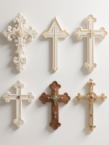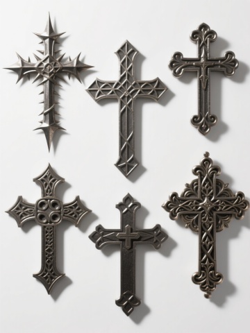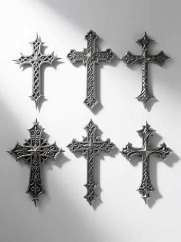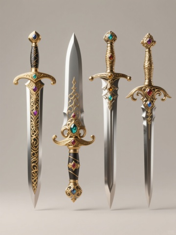 四个不同样式的宝剑,采用简约现代的整体造型,每个宝剑都具有独特的设计细节,保持与原图一致的精致金属质感和华丽装饰风格,宝剑以规整的网格排布在纯色背景上,无任何文字、logo和水印。