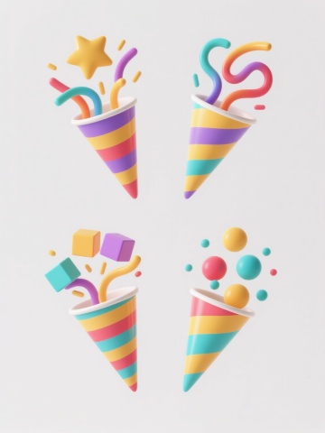一套四个不同元素的系列素材集合,每个元素均采用圆润可爱的3D立体卡通风格,拥有光滑的表面质感和柔和的渐变色彩,高光部分明亮突出,底部带有淡淡的阴影效果,整体呈现出温馨甜美的氛围,元素被规整地排布在纯色背景上;第一个元素是一个蓝白渐变的双层生日蛋糕,顶部插着一根红白条纹的点燃蜡烛,旁边有一个黄色星星形状的饼干,蛋糕表面覆盖着白色奶油,边缘有波浪形花纹;第二个元素是一个粉紫渐变的三层冰淇淋甜筒,最上面是一个粉色的樱桃,甜筒表面有白色的糖粒,每一层冰淇淋的颜色由下至上逐渐变浅,底部是棕色的脆筒;第三个元素是一个黄绿渐变的圆形饼干礼盒,礼盒上系着一个粉色的蝴蝶结,礼盒表面有白色的波点图案,礼盒的盖子微微打开,露出里面的几块不同形状的饼干;第四个元素是一个橙红渐变的圆形甜甜圈,甜甜圈表面覆盖着橙色的糖霜,上面撒着白色的糖屑,中间的孔洞周围有一圈白色的奶油花边,顶部放着一颗红色的草莓。