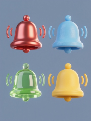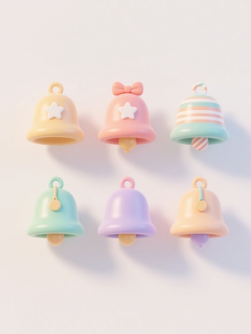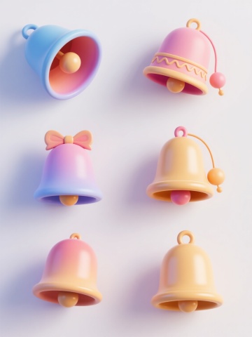 6个不同样式的3D卡通铃铛,采用圆润可爱的造型设计,每个铃铛具有独特的配色方案,有的铃铛顶部有球形装饰,有的带有波浪形边缘,还有的铃铛下方悬挂着不同形状的坠子,铃铛表面呈现光滑的塑料质感,带有柔和的高光和阴影效果,整体排列整齐,悬浮在纯白色背景上,每个铃铛周围伴有简约的震动波纹线条,营造出轻盈活泼的卡通氛围。