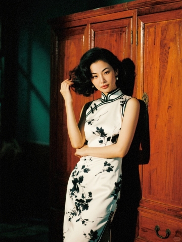 夜晚,一个女生(穿白底黑色水墨印花旗袍,手推波发型)倚在老式红木衣柜前,韵味十足的抚摸头发,看镜头。