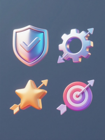 一组4个同风格系列素材的规整排布设计,每个素材均为简约现代的2D图标风格,采用半透明渐变色彩填充,柔和的边缘处理,无明显阴影但有微妙的层次感,纯色背景。第一个图标为绿色渐变的对勾盾牌,第二个为橙色渐变的星形奖章,第三个为紫色渐变的圆形靶心,第四个为粉色渐变的旗帜标签,所有图标保持相同的视觉重量和设计语言,整齐排列成2x2网格布局。