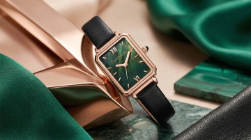复古奢华风腕表,玫瑰金金属质感搭配深绿皮质表带,浮雕纹理与极繁主义细节交织,光影交错间尽显优雅时尚与商务格调。