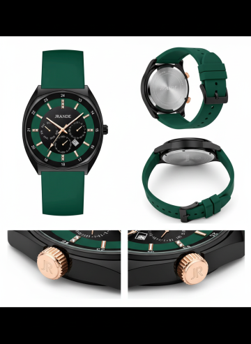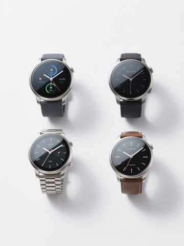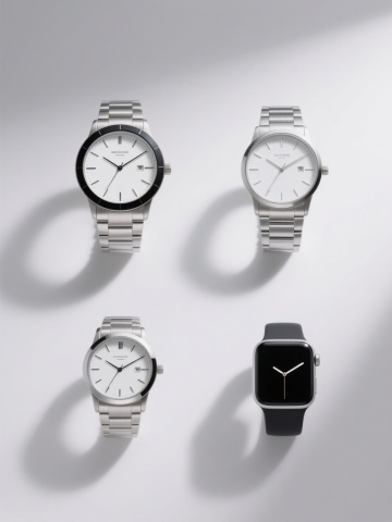 四个不同色彩主题的系列素材集合,每个素材均为简约写实风格的配饰单品,保持相同的纯色背景、规整的居中构图和清晰的产品展示方式,整体排布为2x2网格布局。第一个为深棕色表带配银色表盘的腕表,第二个为深蓝色表带配金色表盘的腕表,第三个为红色表带配黑色表盘的腕表,第四个为绿色表带配银色表盘的腕表,所有腕表均有黄色表扣,表盘内有黑色数字和指针,表带带有均匀分布的圆孔,画面干净简洁,无任何文字和装饰元素。