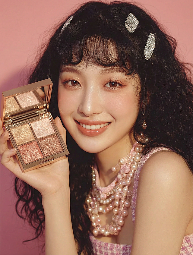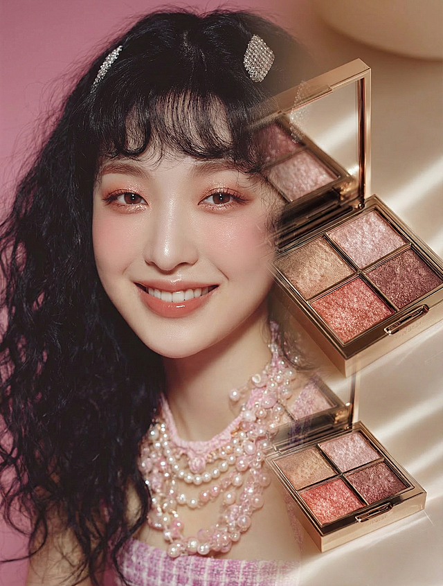 保持全套彩妆产品(包含粉底液、口红、眼影盘、腮红、蜜粉球、化妆刷、眉粉等多件单品)的原有外观和物理结构绝对不变,产品颜色为粉色系,化妆刷采用粉色刷柄玫瑰金刷头,保持产品丰富性不变,不新增不丢失任何单品。产品整体展示在ins风白色梳妆台上,背景为浅奶油色系墙面,拉开景深。加入一位年轻东亚女性美妆博主模特,模特展示产品上妆效果,姿态放松自然,与环境互动。使用柔和漫射自然光,低对比度,阴影淡而柔和,画面明亮干净,少女心氛围感。商业平铺构图,微俯视视角。点缀干枯玫瑰和散落的珠光闪粉,增添精致感。商业高端美妆摄影,4K超清,清晰展示单品细节、化妆刷质感和彩妆色彩层次,高颜值氛围感。严格锁定宽高比为 4:3。保持产品结构,严禁扭曲变形,穿模,挤压。详情