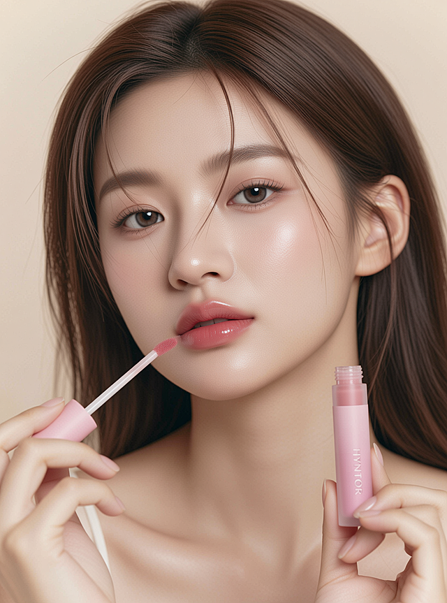 将图1中的口红颜色替换为图2中的裸粉色,同时将模特的唇色也调整为同款裸粉色,保持画面的高级简约美妆氛围详情