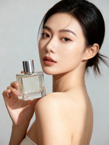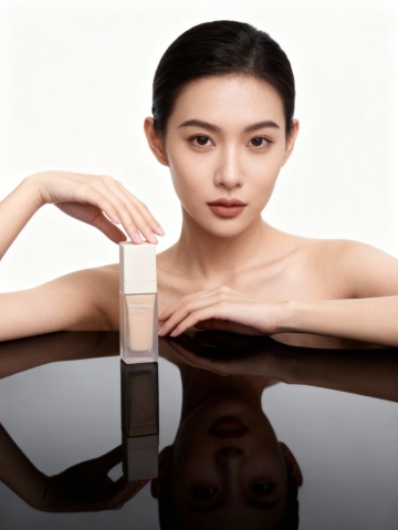 一张以女性面部为特写的美妆护肤主题照片,采用柔和的自然光从上方和侧面均匀照射,营造出明亮、纯净、温暖的氛围。画面中,一位年轻女性闭着双眼,嘴角微微上扬,露出恬静愉悦的微笑,双手轻轻捧起脸颊,姿态自然放松。她的皮肤呈现出极致的清透感、水润光泽和健康的粉嫩色调,肌肤表面仿佛覆盖着一层薄薄的精华液或保湿霜,反射出细腻的光泽,毛孔细腻几乎不可见,质感光滑柔嫩,充满弹性。深棕色的长发柔软地垂落在脸颊两侧,发丝轻盈飘逸,部分细碎的发丝自然散落,增添了画面的灵动与真实感。整体色彩以柔和的米白色为背景,衬托出肌肤的白皙与粉嫩,色调统一和谐,光影过渡自然,高光区域集中在额头、鼻梁、颧骨和下巴等面部高点,阴影柔和地勾勒出脸部的立体轮廓。照片的视觉焦点完全集中在女性完美无瑕的肌肤和愉悦的表情上,构图简洁大方,以人物面部为中心,背景干净无杂物,突出展现皮肤的水润状态和健康美感,传递出舒适、放松、享受护肤过程的情感,具有高度的视觉吸引力和信息传达效率,符合美妆护肤产品目标受众对理想肌肤状态的审美追求。